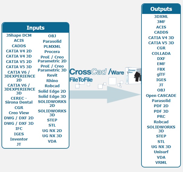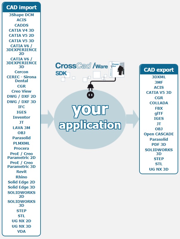 CrossCad/Ware is a CAD license independent API based access for 2D, 3D and PMI data from Datakit, providing fully integrated transfers into your software application and offers 2 different ways to translate data. With CrossCad/Ware there are no CAD APIs or CAD licenses required.